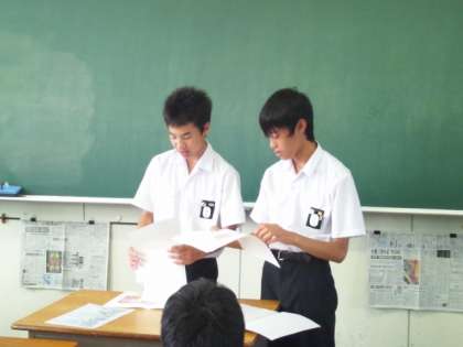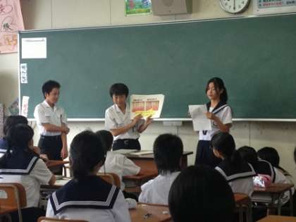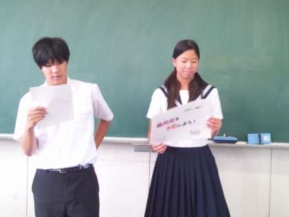 朝のSTで、保健委員による、保健ミニ講座「歯肉炎を予防しよう」の発表がありました。
