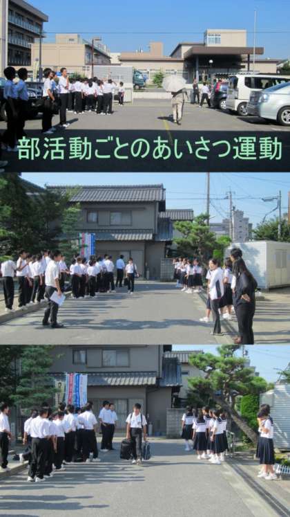 7月10日 部活動ごとのあいさつ運動 公開日 2013/07/10 更新日 2013/07/10 お知らせ 今日から来週の水曜日までの5日間、朝のあいさつ運動が正門・東門・西門で行われています。生徒会の呼びかけに夏の大会を控えた3年生が中心となって活動をはじめました。さわやかで元気のよいあいさつがこだましています。