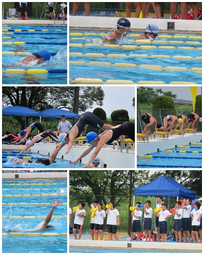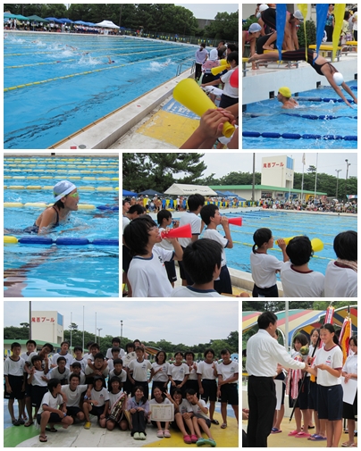 水泳の市大会は尾西プールで行われました。女子は総合3位、男子は惜しくも入賞なりませんでしたが、みんながひとつになって応援に声を枯らし、泳いでいる人の背中を一生懸命押しました。一丸となって、今できる最高のがんばりを発揮しました。見る者にさわやかな感動を与えてくれる泳ぎと応援でした。