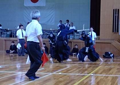 午後からの決勝リーグ。初戦の相手は、海部地区1位通過、予選リーグも全勝で勝ち上がってきた弥冨北中学校です。試合は互いに譲らぬ息の詰まる展開になりました。先鋒が負け、次鋒中堅の連勝で引き離し、副将で追いつかれ、本数の差も無し。プレッシャーのかかる場面でしたが、大将が冷静に決めてくれました。応援の後押しもすごいものがあり、チーム全体で勝ち取った勝利でした。