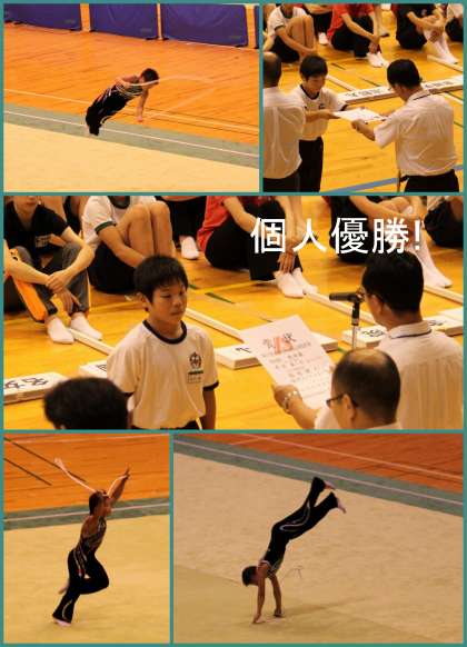 写真を見ても分かるように、難度の高い技にも次々と挑戦し見事に成功させ、種目別の2種目を1位で通過し、男子個人総合で見事優勝をおさめました。中小体の大会は県大会が最後ですが、これからも練習に励み、更なる高みを目指してほしいと思います。