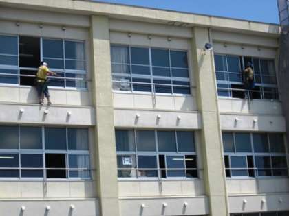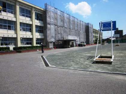 今、今伊勢中では、夏休み中に教室を新しくするために工事をしています。写真は工事中の教室です。また、今日は窓ガラスの清掃も行っています。昇降口も使えないので、1階の渡り廊下に靴箱を置いています。月曜日の学年出校日には2年生は教室が使用できないので、屋運で集会を行います。