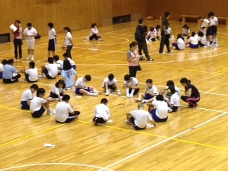 夕食のあとは、ふれあい活動で、ゲームやレクリエーションを通して学校を超えて友達と触れ合う時間を過ごしました。一枚目の写真は夕食です。