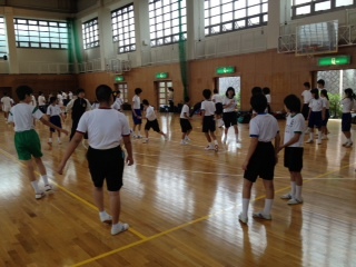 朝食後、体育館では全員でボール競技を楽しんでいます。