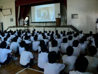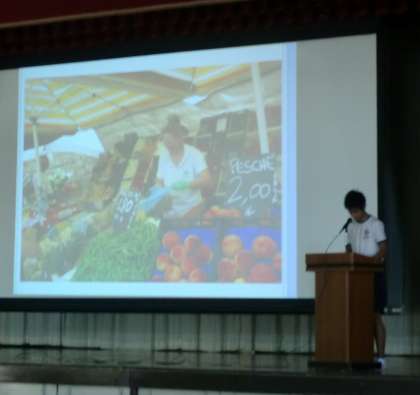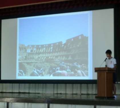 夏休みに行われた、イタリアへの中学生海外派遣事業の報告会を全校で行いました。