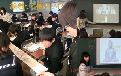 12月4日 社会科の授業 公開日 2013/12/04 更新日 2013/12/04 お知らせ 今日の3時間目に1年4組で社会科の研究授業が行われました。古代の文化についてたくさんの資料が提示され、生徒のみなさんは楽しく学習に取り組んでいました。この中で教科書に載っている絵巻物の複製が教師から見せられるとその長さに驚きの声が…。本物は全長26mにもなるそうです。古代の文化あなどりがたし。歴史も語句だけでなく視点を変えて学習するとおもしろくなりますね。