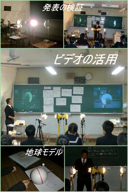 理科の授業研究が行われました。夏は暑く冬は寒い。当たり前のことですが、その理由は何でしょうか。今日はそれを探るために、暗室と太陽、地球のモデルを用意して授業が行われました。モデルも全生徒が観察できるようにと、ビデオカメラとプロジェクターもそれぞれ2台準備されています。
