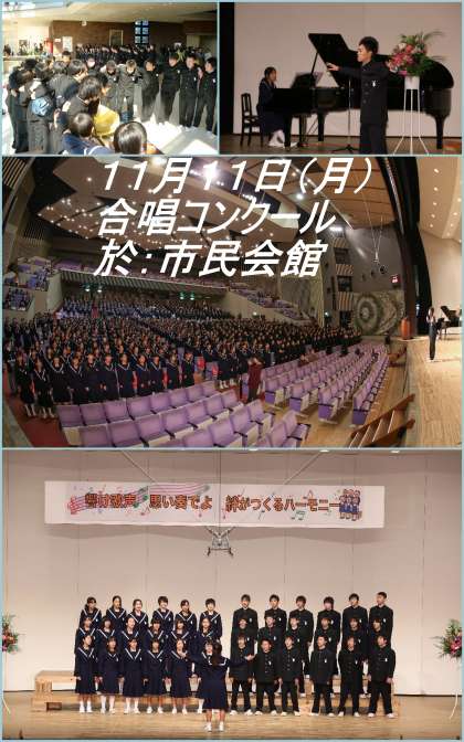 今年度より市民会館での開催となり、大ホールの落ち着いた雰囲気の中ですばらしい合唱が披露されました。特に3年生は、どのクラスも美しいハーモニーと迫力ある歌声で、観客の心を大きく揺さぶりました。合唱を通して強まったクラスの絆は、その後の学校生活のいろいろな場面で生かされていてうれしく思います。