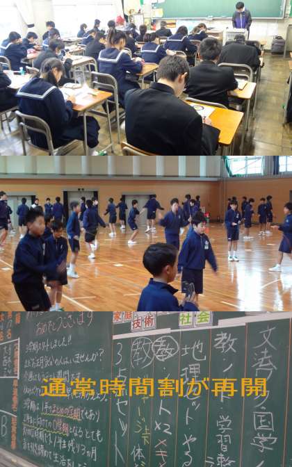 今日より通常日課です。6時間の授業に給食。ふだんの学校生活がもどってきました。休み感覚から一転、集中した授業風景がみられます。そして昨日テスト範囲発表がありましたので、テスト週間ということにもなります。ですから、授業ではテストにかかわる2学期に学習した内容の復習を行う様子も多くみられました。気持ちをしっかりと切り替えて新学期をスタートした今中生。まとめの学期にふさわしい第一歩となりました。