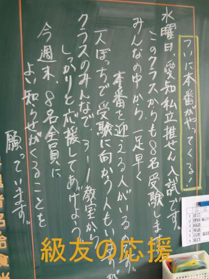 今週は私立高校の推薦入試がありました。各クラスの教室には入試を受ける人たちにあてた応援メッセージが書いてあり、教師やクラスメートからの励ましを受けての受験でした。その入試の合格通知が昨日から学校に届きはじめ、担任から本人や保護者の方へ随時伝えられています。合格の報を受けた生徒は周りからの「おめでとう」の言葉に思わず笑みがこぼれます。希望する学校に決まって本当によかった。次はこれから受験していく仲間を応援する立場になります。よろしくね。