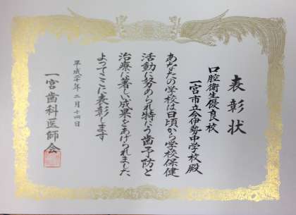 今日は、一宮市地域文化広場で、今年度の本校の歯の健康について、市内の中学校のなかで、もっとも良好であったとして、一宮市口腔衛生優良校の表彰を受けることができました。歯は、健康の源でもあります。今後も歯磨きの励行、虫歯の早期発見と早期の治療に心がけましょう。