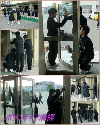 卒業まで、今日を含めて4日となりました。3年生は、今日から3日間ですが、「卒業ボランティア」として、あいさつ運動と昇降口の窓ガラス清掃に取り組みます。この活動は、3年生の一部の生徒から声が上がり、自主的に行われているものです。3年間の思いと、未来に向けての思いをこめて行います。