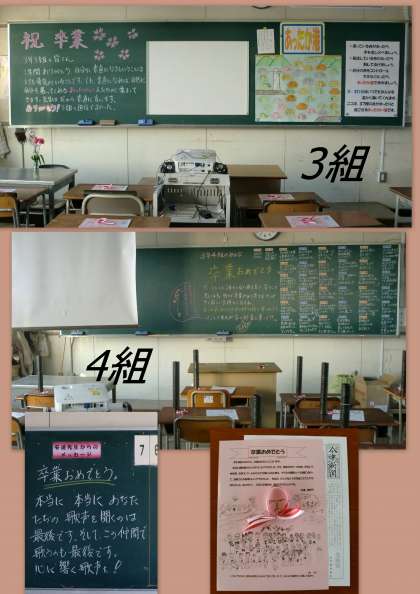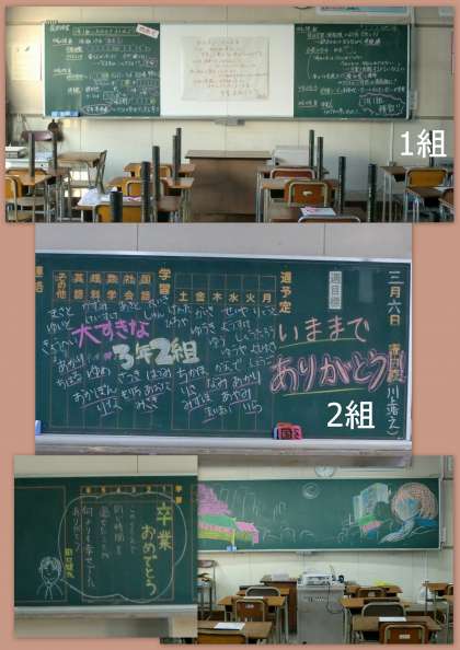 3月6日 卒業式の朝1 公開日 2014/03/06 更新日 2014/03/06 お知らせ 卒業式は、感動のうちに終わりました。今は、校庭で記念撮影。 最後の学級活動はどんなお話があったのでしょうね。歓送に出てきた皆さんの泣き顔から想像ができます。 朝の教室の様子をお伝えします。