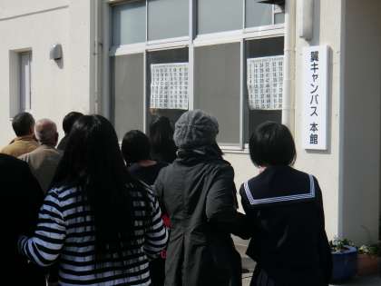 3月12日 定時制高校の合格発表 公開日 2014/03/12 更新日 2014/03/12 お知らせ 午前10時に定時制高校の合格発表がありました。保護者と一緒に緊張した面持ちで発表を待っていました。合格者は,封筒をもらいに行き,これから始まる高校生活の準備に胸を高鳴らせ,笑顔で帰って行きました。