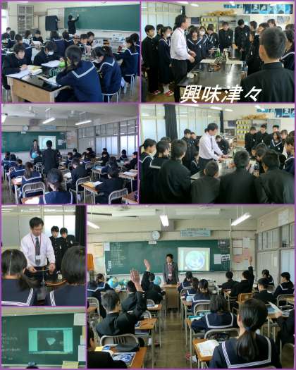 理科室では、ガラス棒を融かして状態変化する様子を演示実験していました。1年生の皆さんに理科室の使い方や実験道具の使い方を説明する時間でしたが、生徒の皆さんの目の輝きがすばらしかったと思います。身を乗り出すように実験を見てくれ、きっと理科好きが増えるんだろうなと思いました。
