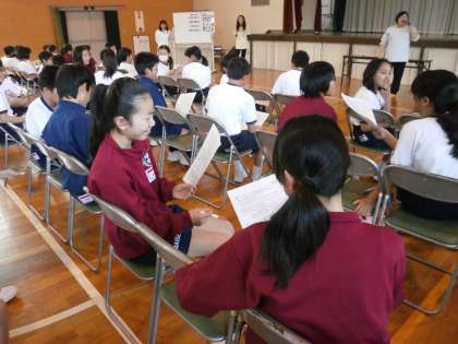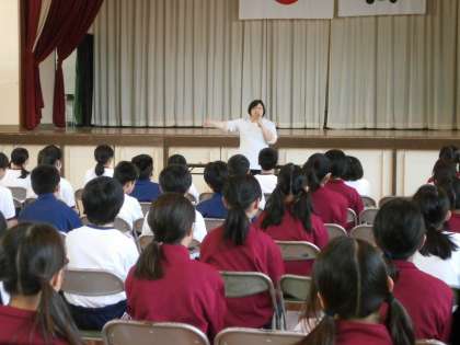 4月24日 1年生セルフディフェンス講座(後半) 公開日 2014/04/24 更新日 2014/04/24 お知らせ 前半に引き続き、セルフディフェンス講座の後半の部が行われました。「自分を大切にするための授業」ということで、不審者に対する撃退方法を身につけ、いじめや暴力、インターネットサイトなどのあらゆる危険や誘惑から自分を守る方法などを学びました。下の写真は、万引きに誘われたときの断り方を、ペアになってシミュレーションをしている様子です。3名の講師の方々に感謝です。