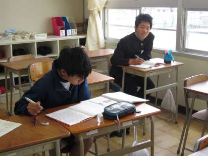 8時から教室を開放し、質問教室がスタートしています。黙々と自学自習に励んだり、先生に教えてもらったり、友達同士教え合ったりする姿が見られます。