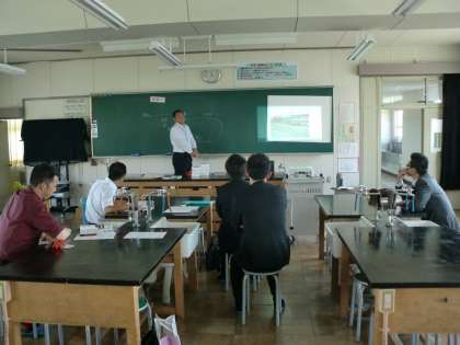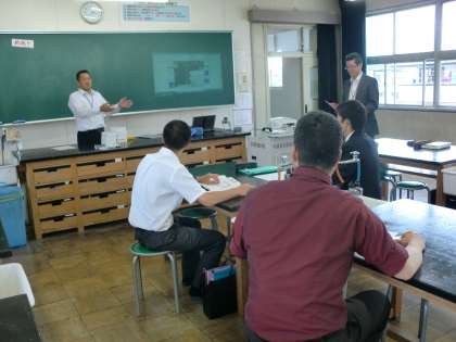 市内で3年生の理科を担当している先生の中から数名の先生が本校に集まり、理科の授業について指導を受けたり話し合いをしたりしています。本校の林先生がリーダーシップをとって、導入の工夫や展開の仕方、新しい教材開発や実験の進め方を伝授します。この講習会は、年間で8回行われ、理科のエキスパートの先生が育っていきます。
