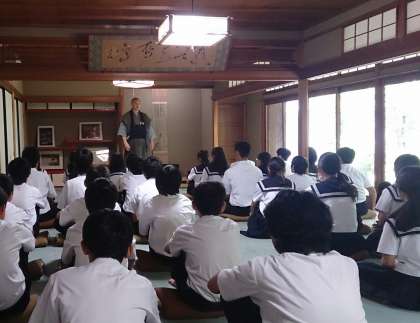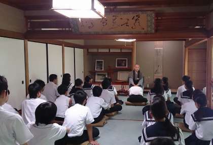 5月29日 3コース、午後の体験から 公開日 2014/05/29 更新日 2014/05/29 お知らせ 3コースは、妙心寺でグリーンティーやお菓子、お尚さんの法話をいただき、座禅体験もさせていただきました。法話では、雑念を捨て心の中を空にすることの大切さを教えていただきました。 京都に来て座禅をし、敬策で叩いていただくという貴重な経験をし、生徒の表情は晴れ晴れとしています。