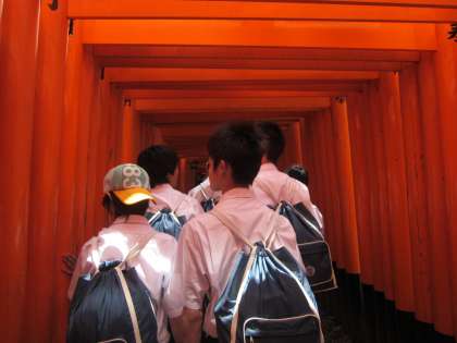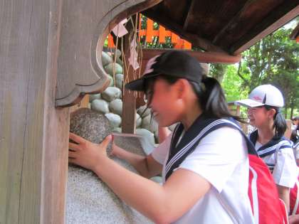 2コースは、午前中に伏見稲荷大社へ行きました。伏見稲荷では、昼食を食べた後、千本鳥居を抜け、おもかる石で自分の願い事がかなうか占いました。「重くて重くて手が滑った〜」と言う生徒や、「軽々持ちあげられた!」と喜ぶ生徒もいました。