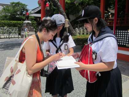 その後の外国人観光客へのインタビュー活動では、はじめは緊張していた生徒たちも、次第に、自分から進んで笑顔で話しかける姿がありました。時間ぎりぎりまで、英語やジェスチャーを使いながら、積極的に会話を楽しんでいました。