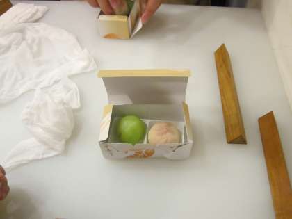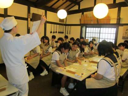 甘春堂では、職人さんの指導のもと、2種類の和菓子を作りました。上手に餡を生地で包み、それぞれのかわいらしい和菓子を作りました。自分で作った和菓子をご家庭にお土産に持って帰りました。