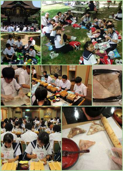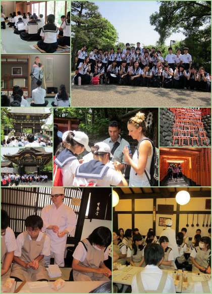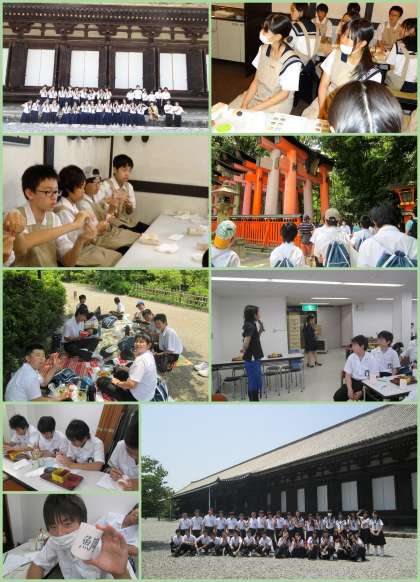 主な活動は、三十三間堂の見学、清水焼絵付け体験、伏見稲荷での外国人インタビュー、和菓子作り体験、妙心寺での座禅体験、京都御苑見学、八橋作り体験でした。どのコースの活動も充実していましたが、特に、外国の人にインタビューしようという活動は、決められた場所だけでなく、違う場所で出会った外国の人にも積極的に声をかける姿が見られたそうです。