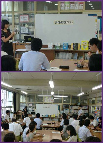 図書館で、職員が中学生になり「自分の働き方を見つけよう」をテーマに、本の紹介をしていただきました。その絶妙な話し方や、本のエキスを上手に説明をしていただけるため、聞いている我々も「読んでみたい」と強く思いました。まして中学生の皆さんが聞いていたら・・・と考えると、「ブックトーク」の力はすごいものがあることが分かりました。