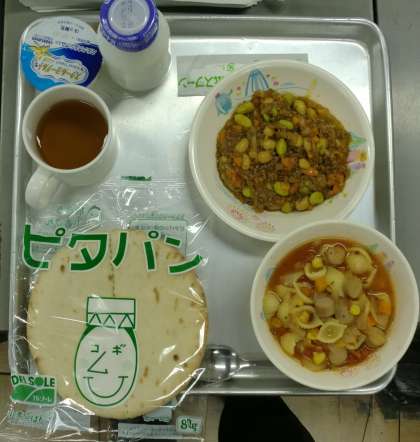 今日の献立は、ピタパン・牛乳・ミネストローネ・ドライカレー・フローズンヨーグルトでした。国際的な献立ですね。ピタパンは中近東地方で焼かれたパンで、高温で焼くため、中が空洞になり、サンドイッチのようにして食べることができます。今日はカレーをはさんで食べましたので、インドテイストです。そしてミネストローネはご存知トマトを使ったイタリアの野菜スープです。また、ヨーグルトは世界各地で似たようなものが作られていますが、ブルガリア産のものが有名ですね。