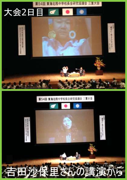 昨日と今日、2日間にわたって、愛知、三重、岐阜、静岡、石川、富山、福井の7県の中学校の校長先生の大きな研究大会が三重県津市で開かれました。3日は、9部会に分かれて、熱心な話し合いが行われました。そして今日4日は、女子レスリングの吉田沙保里選手の講演会がありました。