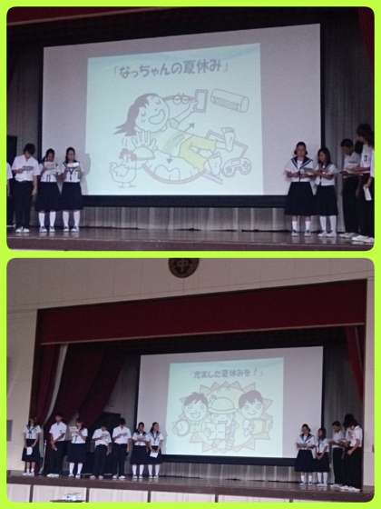 7月18日 夏休みの過ごし方について 公開日 2014/07/18 更新日 2014/07/18 お知らせ いよいよ明日から夏休みです。体と心の元気があってこそ、充実した楽しい夏休みになります。 夏休みの過ごし方を、3年生保健委員がアニメを使いながら説明しました。早寝、早起き、朝ごはんは基本中の基本です。係の皆さんの教えを守って、規則正しい生活、実り多い夏休みにしましょう。 休み明け、みなさんの元気な姿に会えることを楽しみにしています。