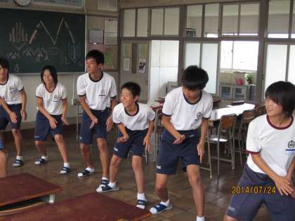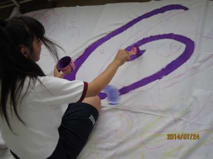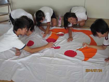各クラスごとに、応援団のリーダー達が、群団応援合戦の振付を試行錯誤しながら考え、作り上げていました。太鼓のリズムに合わせて踊りながら、意見を出し合って納得のいくまで考え、教室内は熱気に包まれていました。また、団旗を作る生徒達は、大きな白地の布に下絵を考えて描き、協力して色を塗っていました。他の群団に負けまいと、デザインに工夫を凝らし、丁寧に着色していました。