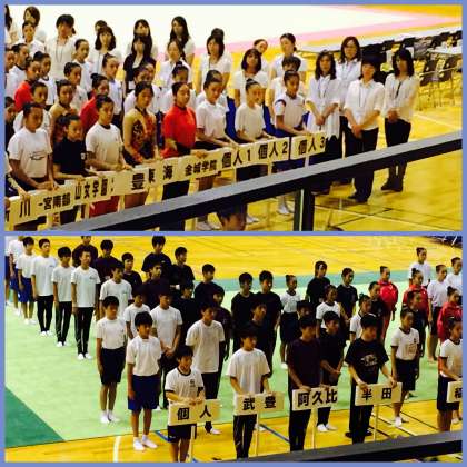 パークアリーナ小牧では、新体操県大会が行われています。本校からは女子個人、男子個人にそれぞれ選手として出場します。写真は、開会式の様子です。健闘を祈っています。