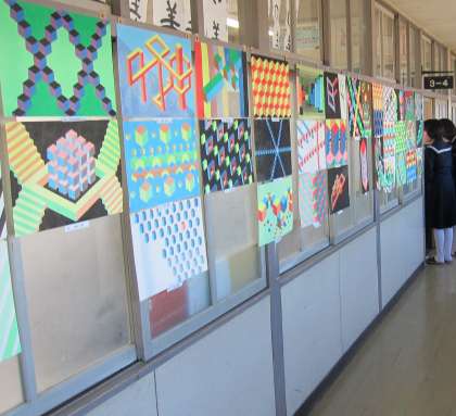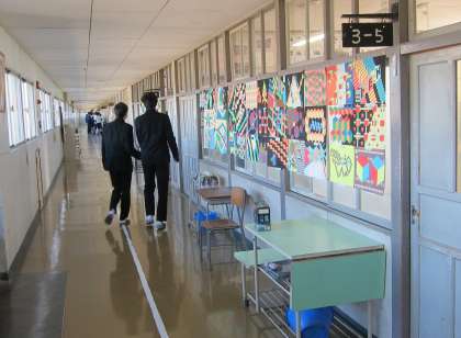 3年生が2学期に制作した立体感のある平面構成の作品が、今3年生の廊下に展示されています。図法を使って、考えた図案を色のついた砂で彩色して行くという「サンドアート」の作品。ほぼ全員の作品が並びました。非常に工夫のある素晴らしい作品に仕上がっています。卒業まであと1カ月ですが、これも思い出のひとつとして心に残ることでしょう。