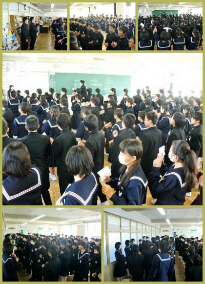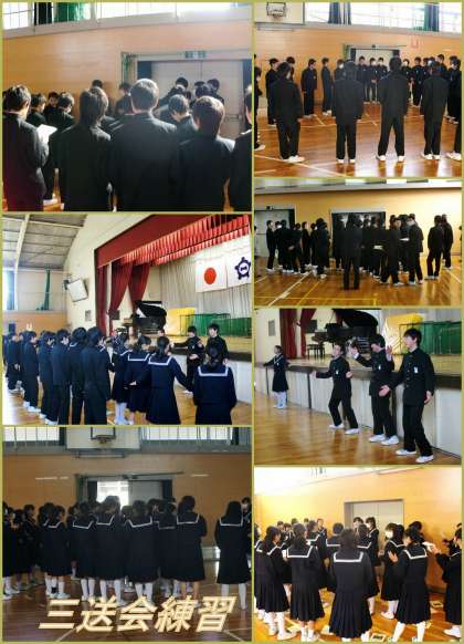 2月19日 三送会練習 公開日 2015/02/18 更新日 2015/02/18 生徒会活動 3年生はファイナルテストを行っています。ついに、中学校で行う最後のテストです。その時間帯に、1・2年生は、屋内運動場や特別教室に群団ごとに集まり、3年生へ送るエールの練習です。どの群団でも、2年生のリーダーが中心となって規律正しく、3年生への強い思いをこめて練習が進められています。2年生の顔つきが変わってきました。
