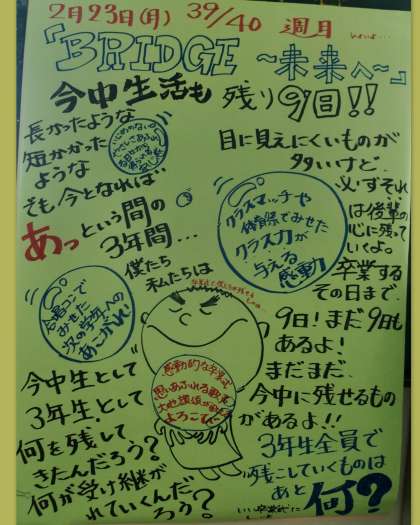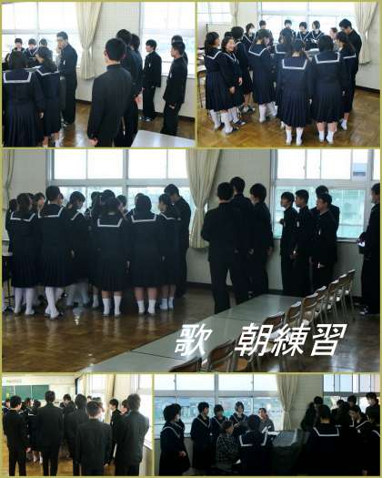 2月25日 朝練習 公開日 2015/02/25 更新日 2015/02/25 お知らせ 3年生が卒業式の歌の自主練習を始めました。7時30分から音楽室に有志が集まって練習を始めています。音楽の先生はもとより、担任の先生もいっしょになって歌っています。廊下に歌声が響き、卒業式ムードがぐっと上がってきました。卒業式まであと1週間です。どのように学年を仕上げてくるか、それもまた楽しみの一つです。