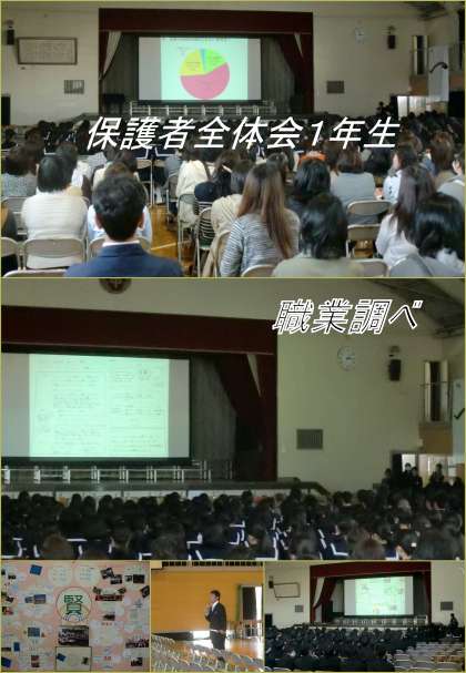 1年生も2年生同様保護者全体会を6時間目に行いました。一年間の思い出をスライドで振り返った後、各学級が成長したことを発表しました。その後はアンケートの発表があり、総合的な学習の時間の発表として「職業調べ」について発表しました。