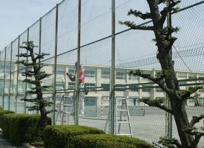 休日にしかできない工事があります。今日は、教室の黒板の張替え、フェンスのネットの張替えが行われています。