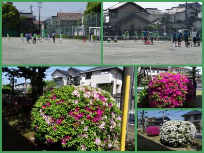 5連休の初日です。今日も暑くなりそうです。予報では気温は28度に達するようです。それでも朝から厳しい日差しの中,いきいきと部活動が行われています。ハンドボール部男子は,花壇の土の入れ替え作業の手伝いを行ってくれています。水泳部のプール掃除は,この連休中が勝負です。校庭の木々もハナミズキの花がほぼ終わり,ツツジの花が満開です。