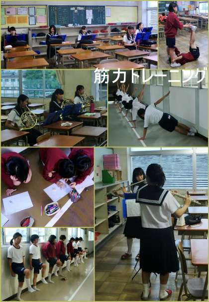 1・2年生は、明日からテスト週間に入りますので、今日がひとまず最後の部活動になります。しかしあいにくの天候ですから、室内で筋力トレーニングを行っている人がいたり、再来週に迫ってきた自然教室の学級ごとの出し物の練習をしたりしているグループがあります。