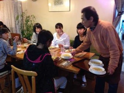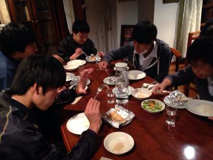 各クラスがペンションに入り、食事の時間となりました。コース料理に生徒たちは大喜びです。お腹も空いていたようで、おいしく料理をいただきました。