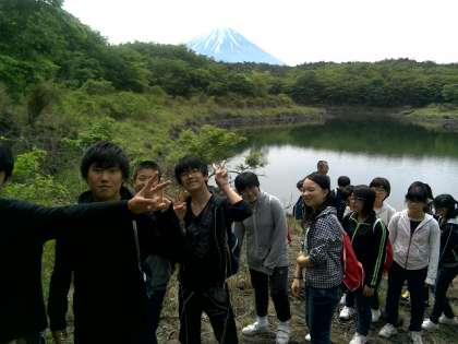薄曇りですが,とても気持ちのよい日になっています。富士山もとてもきれいに見ることができます。ガイドの「マコトさん」「マリさん」の案内で,樹海の中(といっても遊歩道ですが)を歩いて行きます。富士山は噴火でできた山ですから,足下は溶岩でできています。火山ガスの抜けた細かな穴のあいた石がゴロゴロ転がっています。ここの自然物は持ち帰ってしまうと罪に問われるそうです。しっかりと見て,心に残して帰ります。