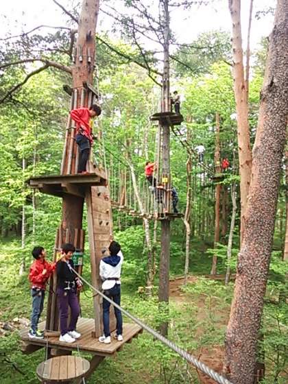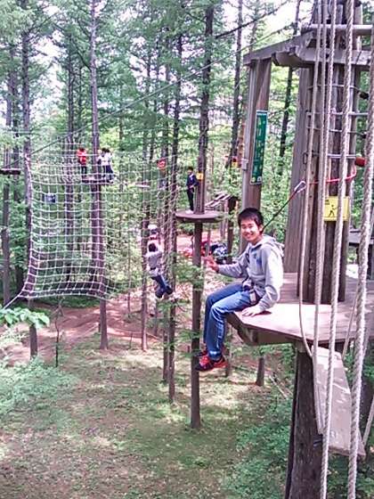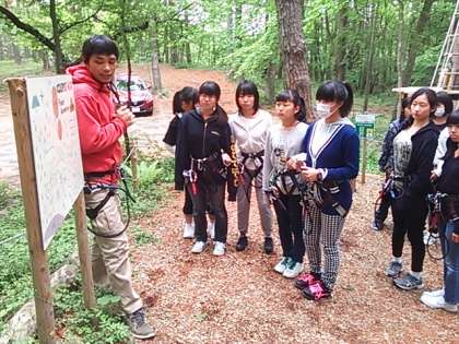 森林自然体験コースは、フォレストアドベンチャーを行いました。木と木の間にワイヤーが張り巡らされ、ハーネスをつけて渡って行きます。高い所では地上14mもあり、140mのターザンロープも楽しみました。2時間半の体験はあっと言う間でしたが、体力自慢の生徒たちも握力が残っていないほどの運動量でした。みんな大満足で、これから昼食会場に向かいます。