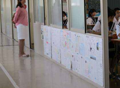 朝から強い日差しが照りつけていますが、学校公開日ということで1時間目から熱心に授業を参観する保護者の方の姿が見られました。3年生の廊下には修学旅行のレポートが並んでいます。今日は進路説明会や部活動懇談会もありますので、ぜひたくさんのご参観をお待ちしています。