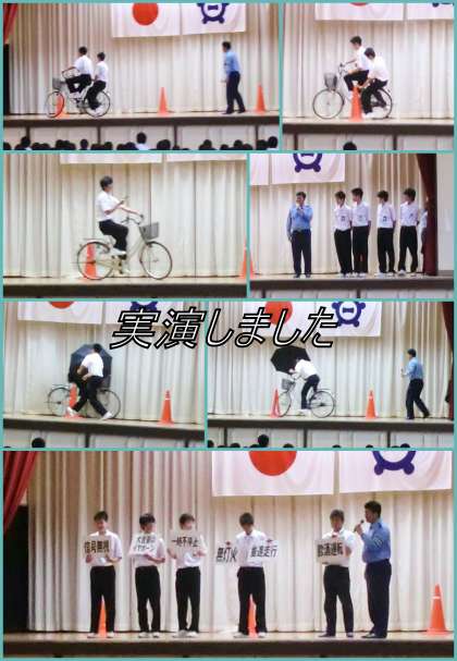 二人乗りに傘さし運転、携帯電話を使いながらの運転や、大音量の音楽をイヤホンで聴きながらの運転などを、実際に3年生の男子生徒が行い感想を述べることで危険性を訴えました。またそれぞれについての罰金も教えていただき、その高額なことに驚かされました。