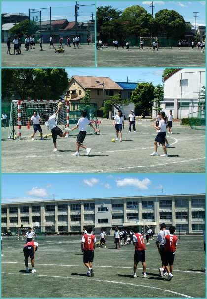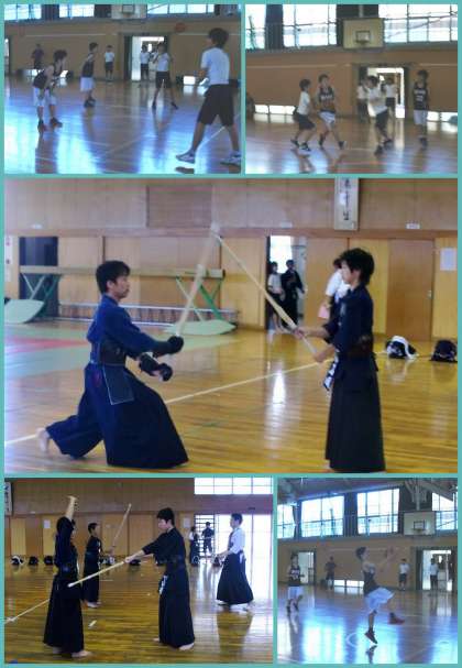 雨上がりのさわやかな朝を迎えました。運動場には、心地よい風とブラスバンドの美しい音色が漂っています。この音楽をバックに、運動場はハンドボール部、テニスコートではテニス部の皆さんが汗を流しています。また、屋内運動場では、バスケットボール部が近隣の中学校と合同練習を、武道場では外部コーチの先生をお招きして剣道の練習が行われていました。