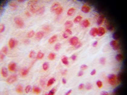 写真では分かりにくいのですが。中央から少し右上に見えるのが,細胞分裂後期の様子です。