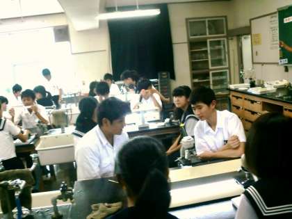 細胞分裂の様子の観察実験を行いました。中学理科では,難しい実験の1つです。なかなか分裂最中の細胞に出会えないからです。そんな中「あった!」と喜びの声が稀に聞かれます。前回のクラスでは2人の生徒が,今回も1人の生徒が出会うことができました。あきらめかけていた時にその声を聞くと,再びやる気がわいてきます。みんな最後まで集中して観察を続けました。