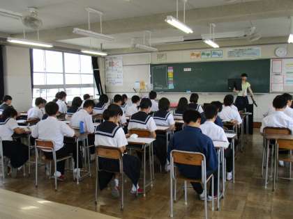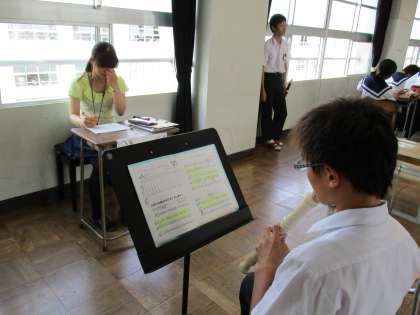 音楽の授業でリコーダーのテストが行われています。全体で練習後に、1人1人のテストです。生徒の皆さんは、緊張しながらも一生懸命リコーダーを吹いています。練習の成果を出すことができたでしょうか。