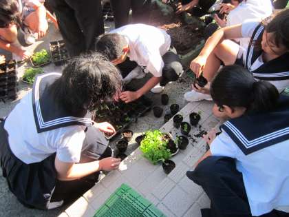 本日の委員会時に、緑化委員と代議員によって各クラスのサルビア苗の植え替えを行いました。用意された苗は、緑化委員が5月に種をまき、毎日水やりを絶やさず大切に育ててきた苗です。代議員にも手伝ってもらい、各クラスのサルビア一人一鉢運動に向けて、クラス人数分のポットをつくりました。慣れない作業ではありましたが、多くの生徒や先生に手伝っていただき、無事に全クラスつくり終えることができました。